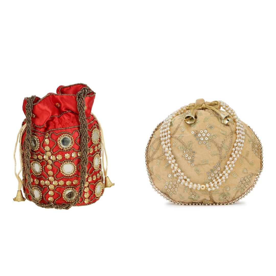 Combo – Designer Embroidered Potli Bag – Red & Beige