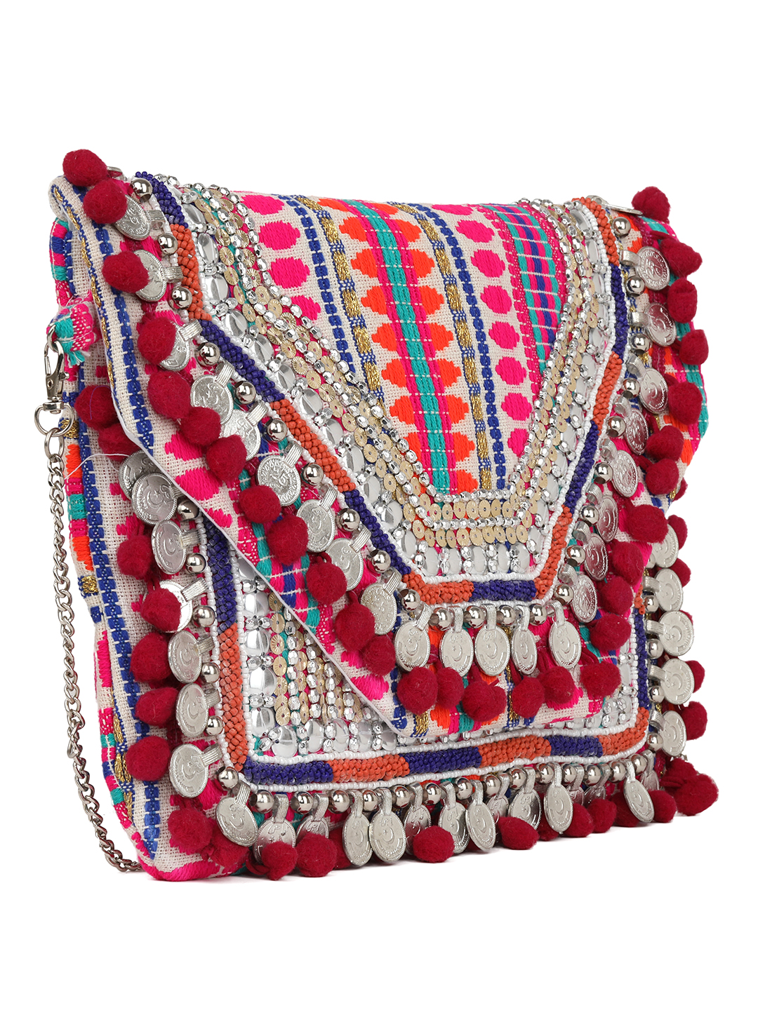 Combo Of Boho Bag And Pink Embroidered Box Clutch For Girls and womens