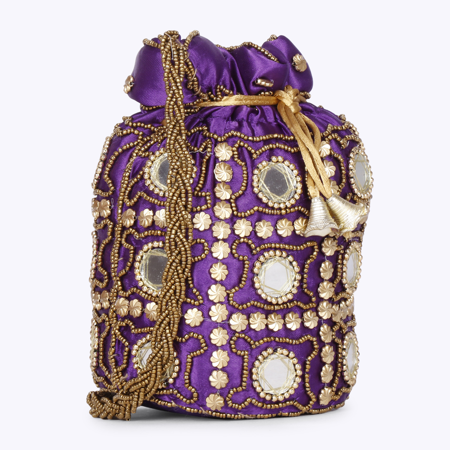 Purple and gold-toned embellished potli clutches Has wrist loop 1 main compartment with drawstring closure Size & Fit Height: 18 cm Width: 10 cm Depth: 2 cm Material & Care Fabric Wipe with clean, dry cloth